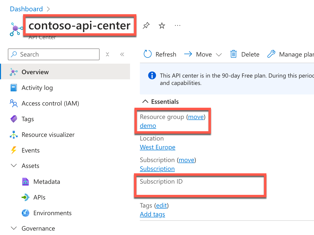 Dalla pagina Panoramica dell'istanza del Centro API di Azure copiare il nome dell'istanza del Centro API, il nome del gruppo di risorse e l' ID sottoscrizione. Queste informazioni sono necessarie per configurare il ApiCenterProductionVersionPlugin, affinché possa connettersi all'istanza del Centro API di Azure.