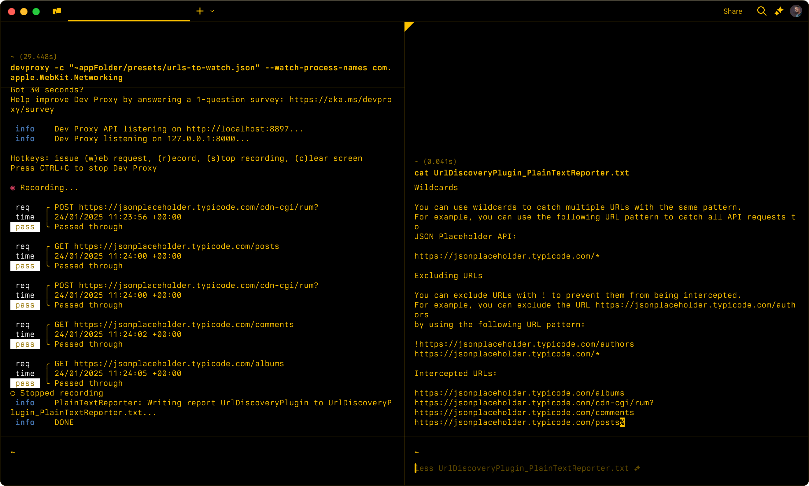 Crea un elenco di URL intercettati dal proxy di sviluppo. Usare questo plug-in per informazioni sugli URL che l'app chiama e su come configurare il proxy di sviluppo per simulare i comportamenti.