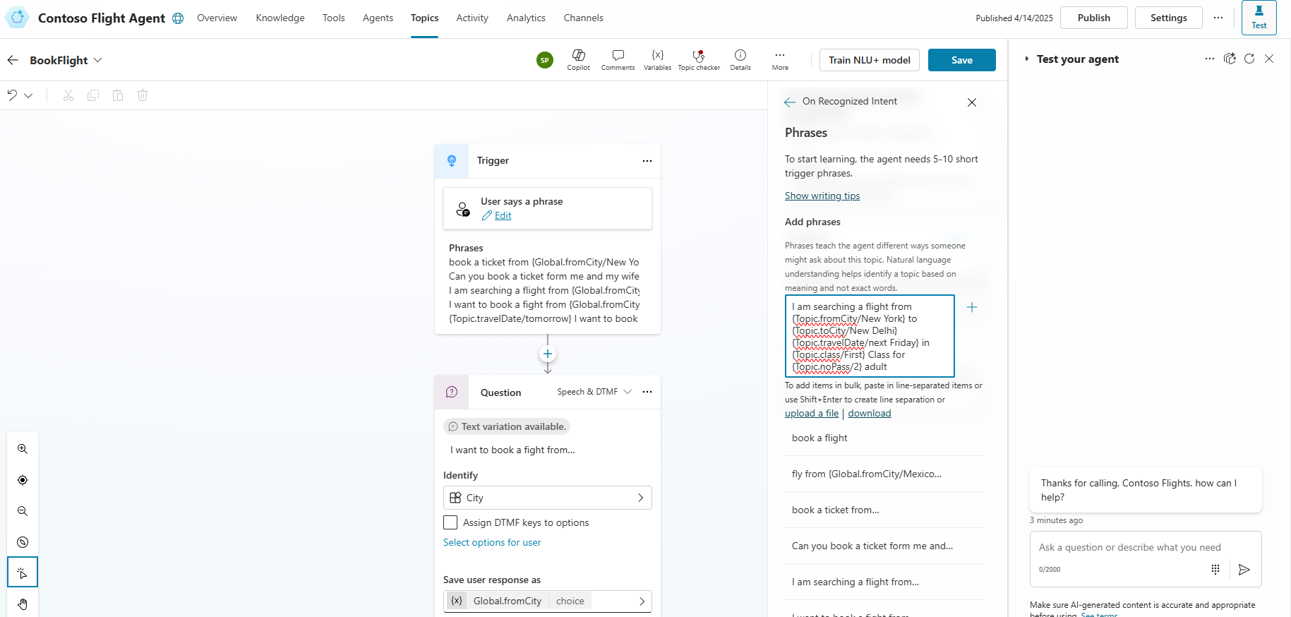 Per restituire il valore massimo di NLU+, è importante aggiungere annotazioni di entità alle frasi trigger dell'argomento per ogni argomento. Aggiungendo annotazioni di entità all'interno degli esempi che attivano un argomento, NLU+ può estrarre le entità come parte del processo di attivazione di un argomento.