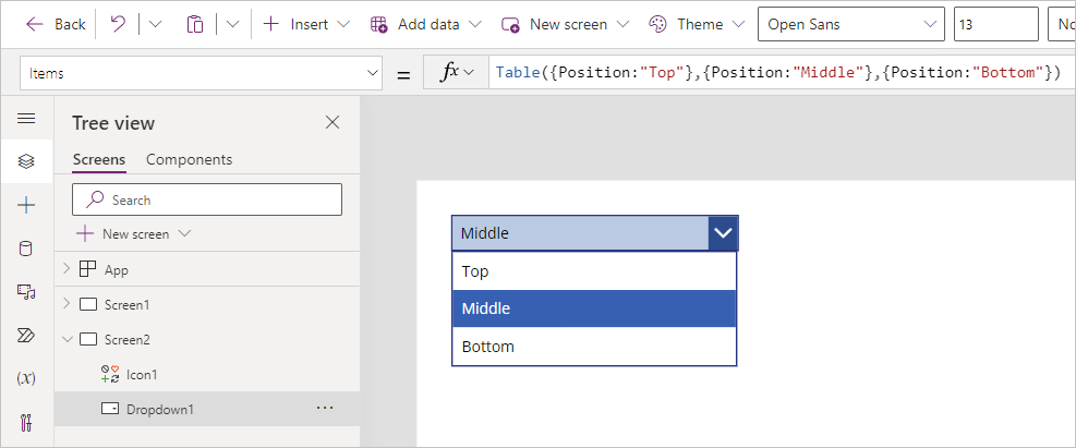 Table({Position:"Top"},{Position:"Middle"},{Position:"Bottom"})In tal modo si crea una tabella di record con una singola colonna chiamata Posizione con tre record chiamati Alto, Basso e Medio. Se si seleziona il controllo a discesa tenendo premuto ALT vengono visualizzati questi valori.