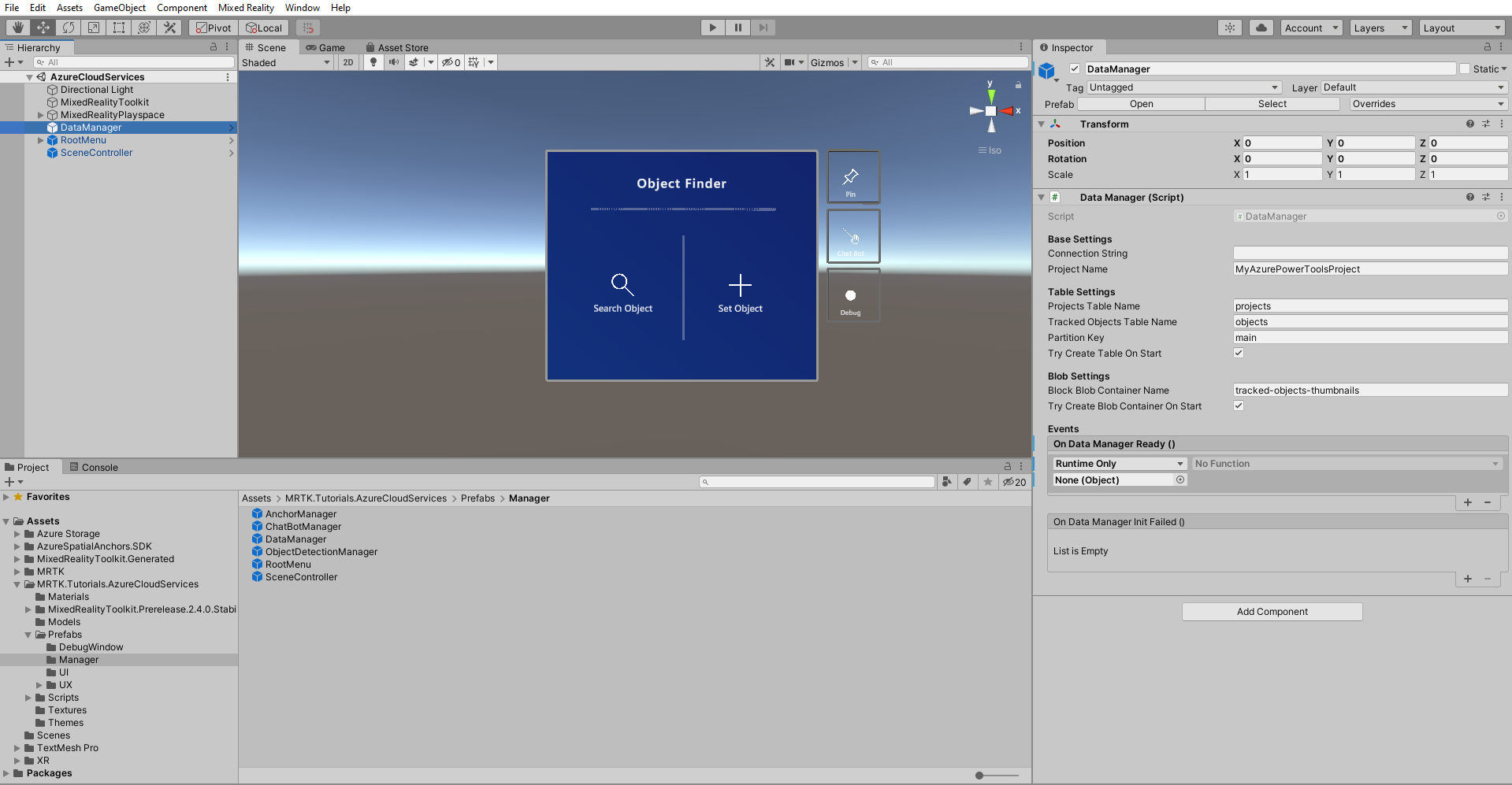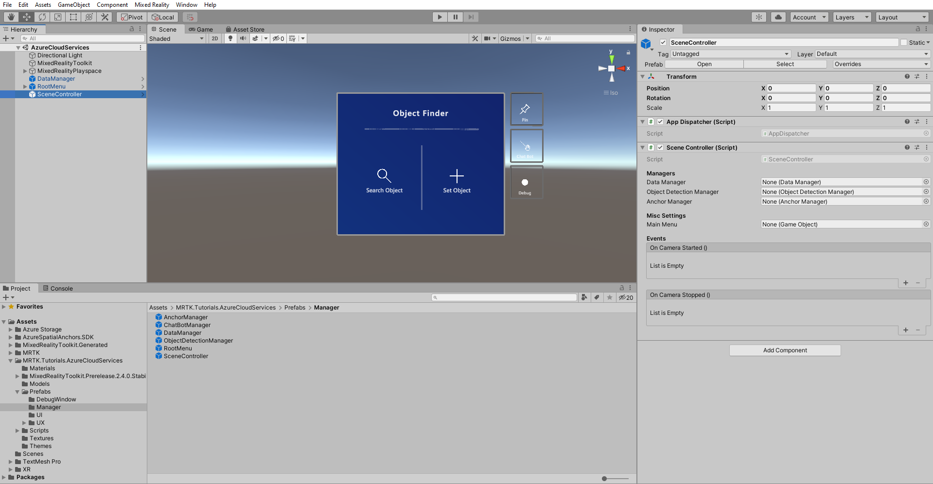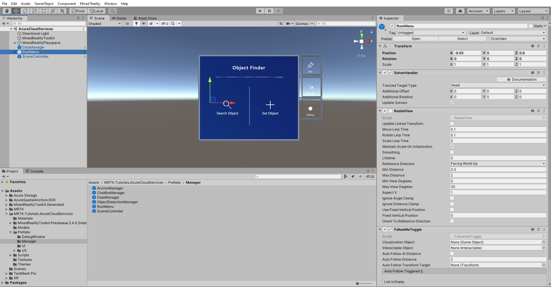 Nella finestra Progetto passare a Asset>MRTK. Tutorials.AzureCloudServices>>Manager cartella. Tenendo premuto CTRL, selezionare SceneController, RootMenu e DataManager per selezionare i tre prefab: