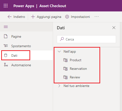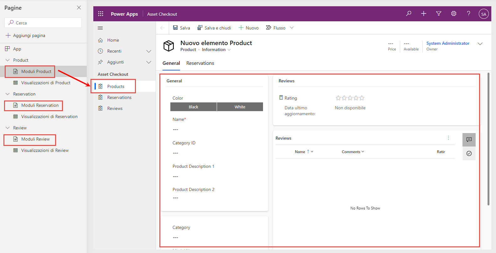 Considerare l'app Asset Checkout che contiene tre tabelle di dati, Product, Reservation e Review.