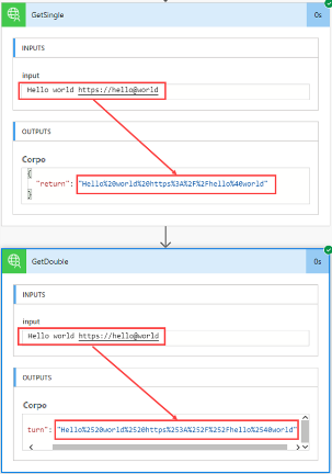 Quando si esegue un flusso di Microsoft Power Automate che chiama entrambe le azioni con un input complesso, la doppia codifica passa lo stesso valore di testo all'API, ma con doppia codifica.