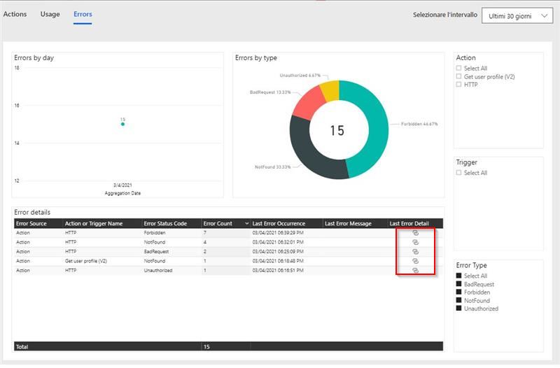 Lo screenshot precedente mostra la colonna Dettagli ultimo errore nella tabella Dettagli errore. Il passaggio del mouse sulla colonna visualizza un collegamento diretto all'esecuzione non riuscita e ai suoi dettagli.