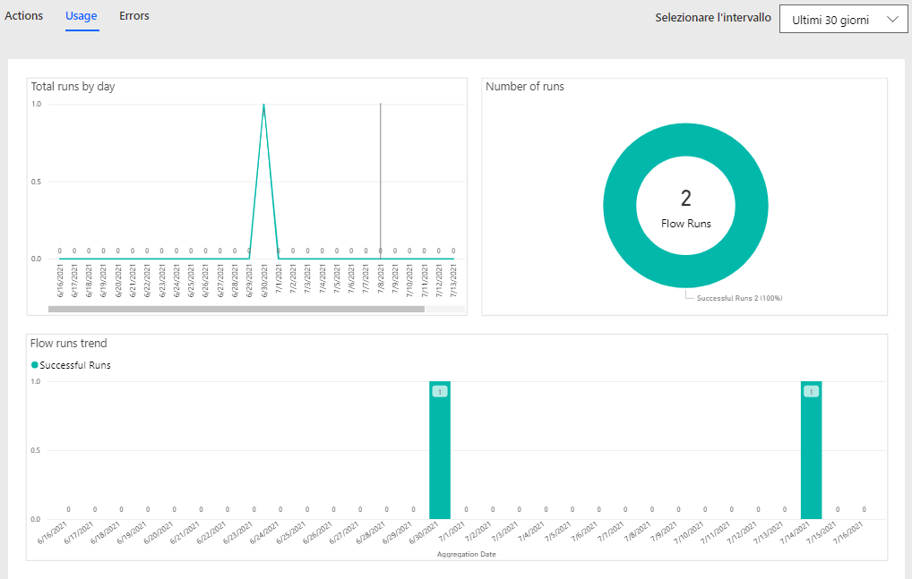 Le analisi Utilizzo forniscono una panoramica dettagliata di tutti i flussi eseguiti nell'intervallo selezionato. Questi oggetti visivi offrono un quadro generale del numero totale di flussi eseguiti e di quanti sono stati eseguiti correttamente o meno. È possibile modificare l'intervallo per visualizzare gli ultimi 30, 14 o 7 giorni.