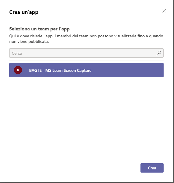 Selezionare il team per l'app.