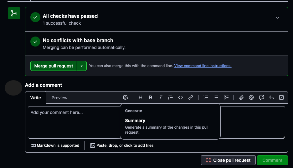 - Riepiloghi delle richieste pull: generare riepiloghi completi delle modifiche apportate in una richiesta pull, aiutando i revisori a comprendere rapidamente l'ambito e l'impatto delle modifiche