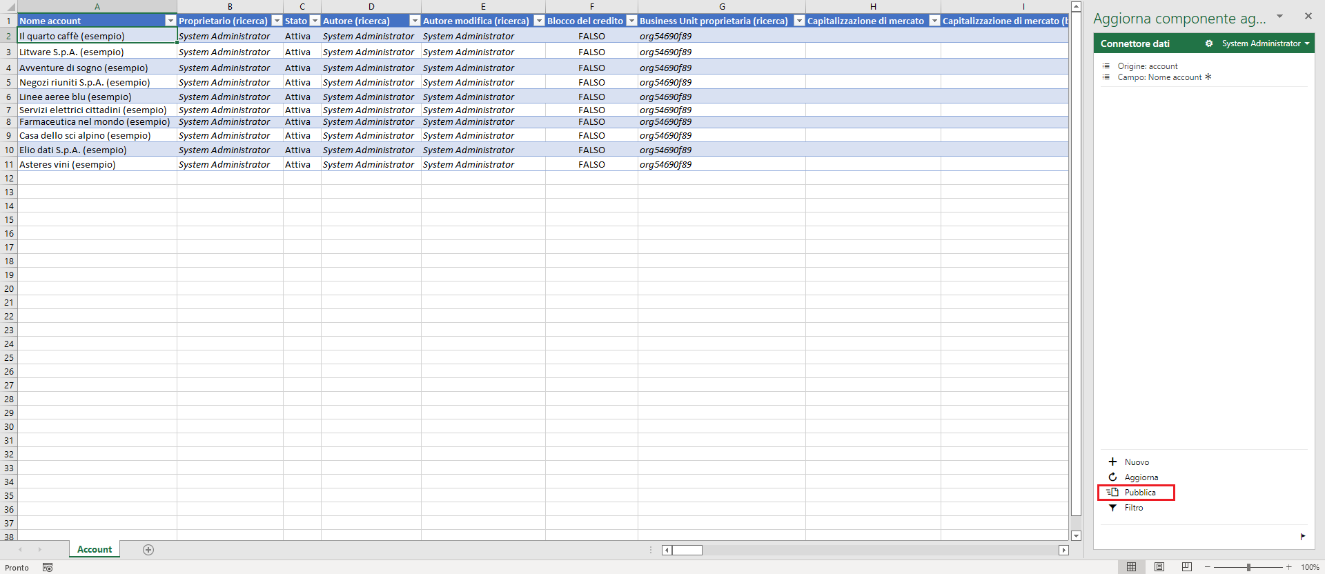 Dopo alcuni istanti, i dati verranno visualizzati nel foglio di calcolo e sarà possibile usare Excel per aggiungere, aggiornare o eliminare dati mediante i pulsanti nel riquadro del componente aggiuntivo. Il pulsante Pubblica (nel pannello del componente aggiuntivo) salva le modifiche.