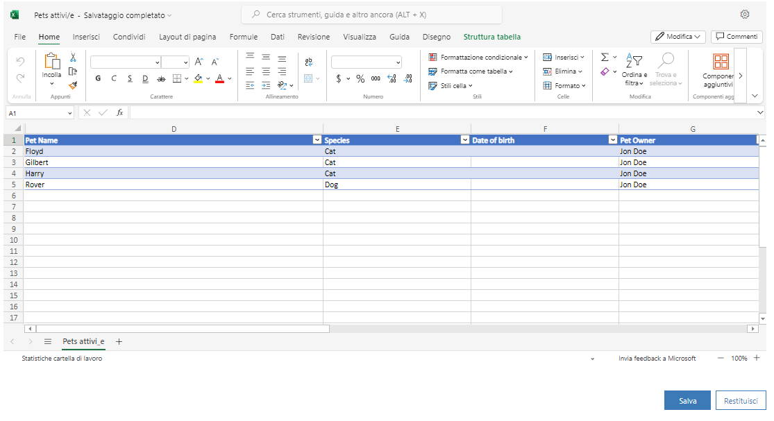 La funzionalità Apri in Excel Online nelle app basate su modello visualizza le righe e le colonne dalla vista della tabella corrente e permette di apportare modifiche rapide, creare nuove righe e quindi salvare nuovamente le informazioni aggiornate in Dataverse.