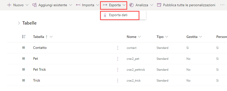 L'opzione Esporta dati in Power Apps Maker Portal è una semplice esportazione che estrae tutte le colonne e tutte le righe per una o più tabelle.