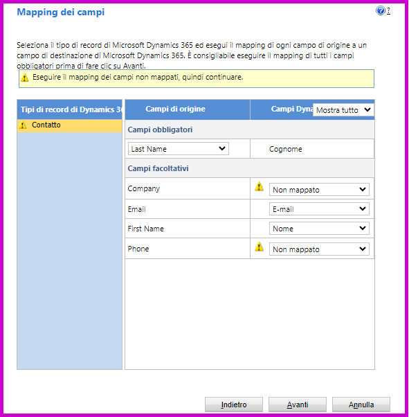 La procedura guidata di importazione dei dati supporta il semplice mapping da colonna a colonna e gestisce anche il mapping dei valori di scelta e delle colonne di ricerca del mapping.