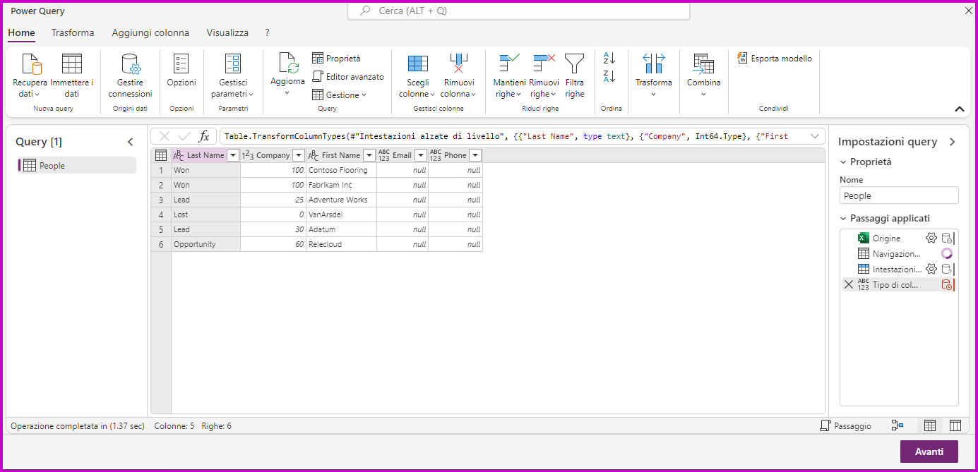 L'importazione di dati in Power Apps Maker Portal usa PowerQuery per eseguire l'elaborazione di estrazione, trasformazione e caricamento.