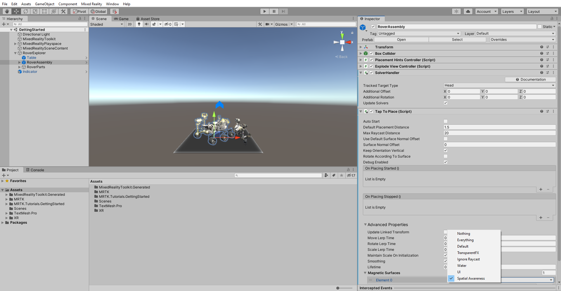 Con l'oggetto RoverAssembly ancora selezionato nella finestra Hierarchy, nella finestra Inspector individuare l'evento On Placing Started (). Selezionare l'icona + per aggiungere un nuovo evento.