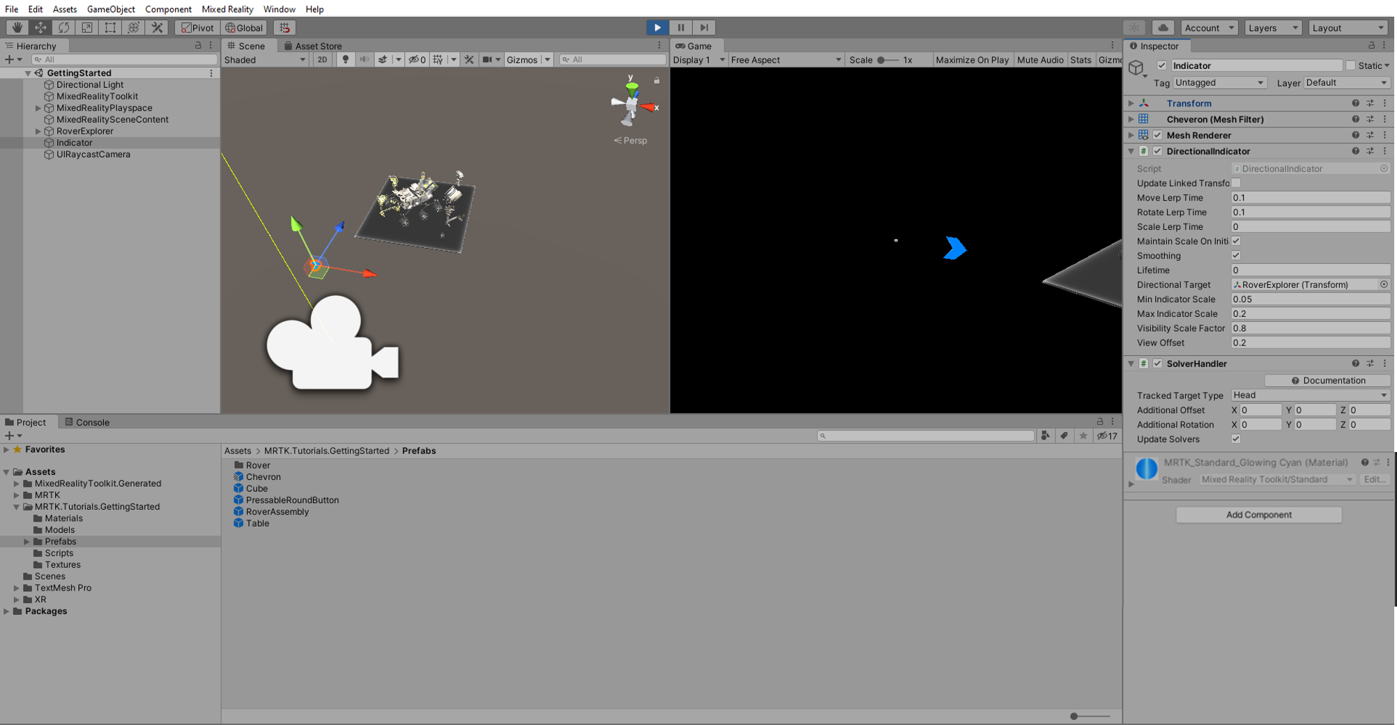 Nella finestra Project passare alla cartella Assets>MRTK.Tutorials.GettingStarted>Prefabs. Trascinare il prefab Chevron nella finestra Gerarchia e impostare la Posizione di trasformazione su X = 0, Y = 1.5, Z = 2 per posizionarlo vicino all'oggetto RoverExplorer.