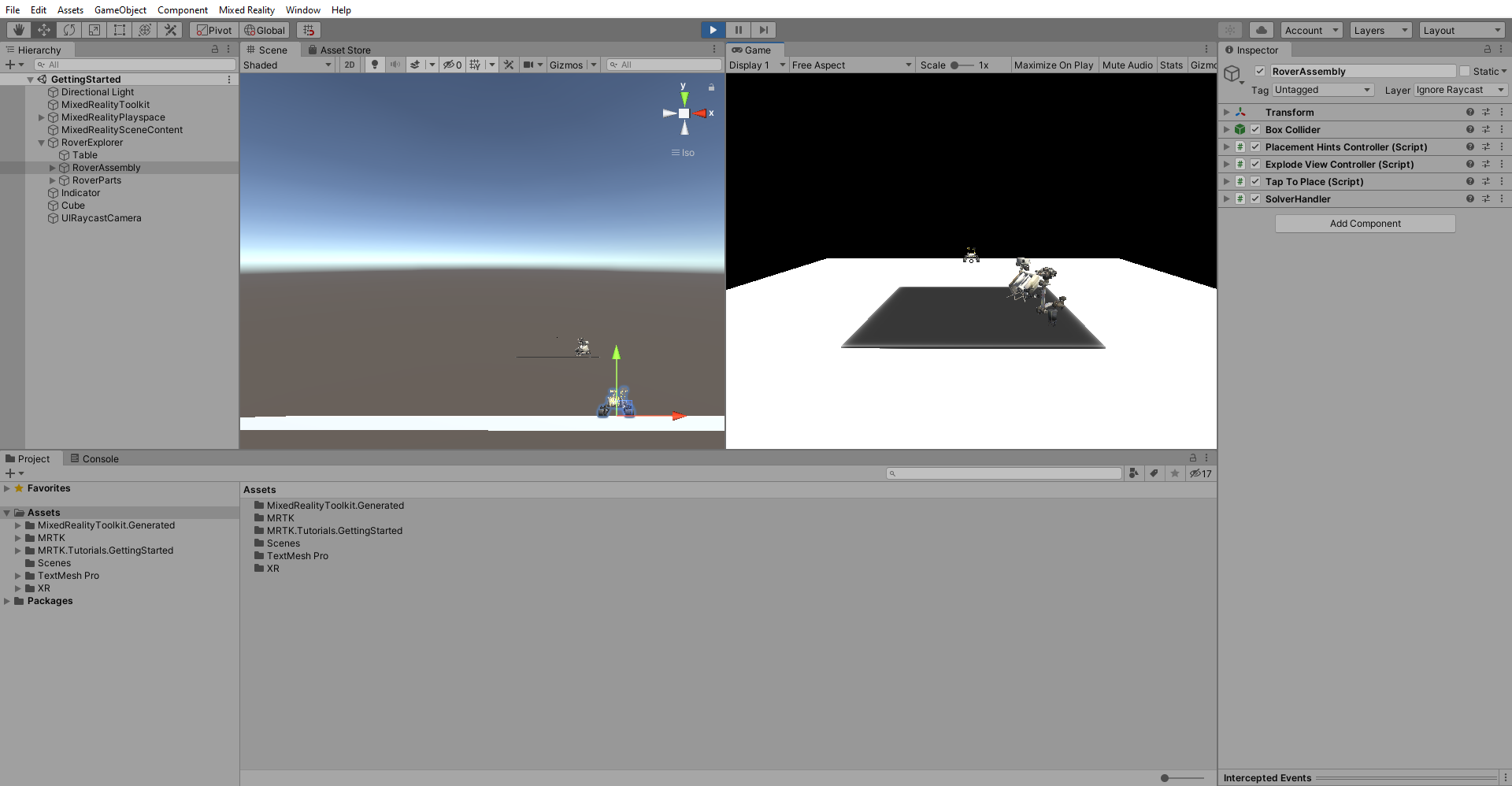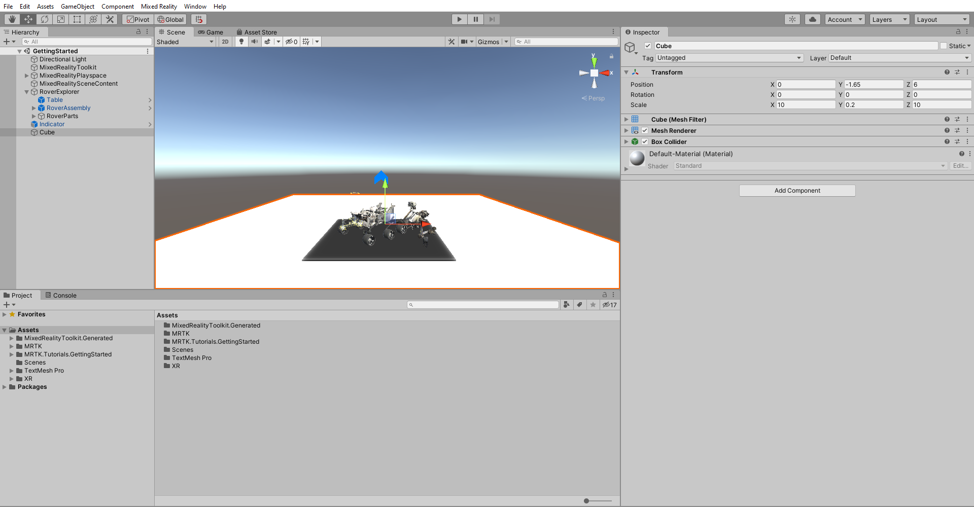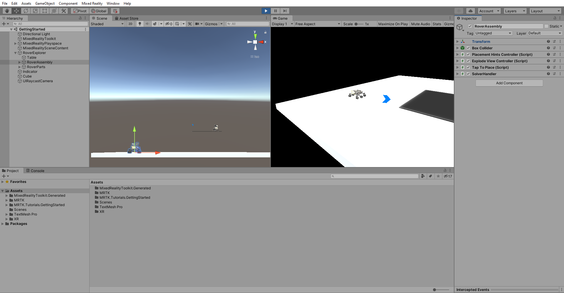 Per attivare la modalità di gioco , premere Play, quindi tenere premuto il pulsante destro del mouse mentre si sposta il mouse verso il basso, fino a quando lo sguardo fisso non raggiunge l'oggetto RoverAssembly .