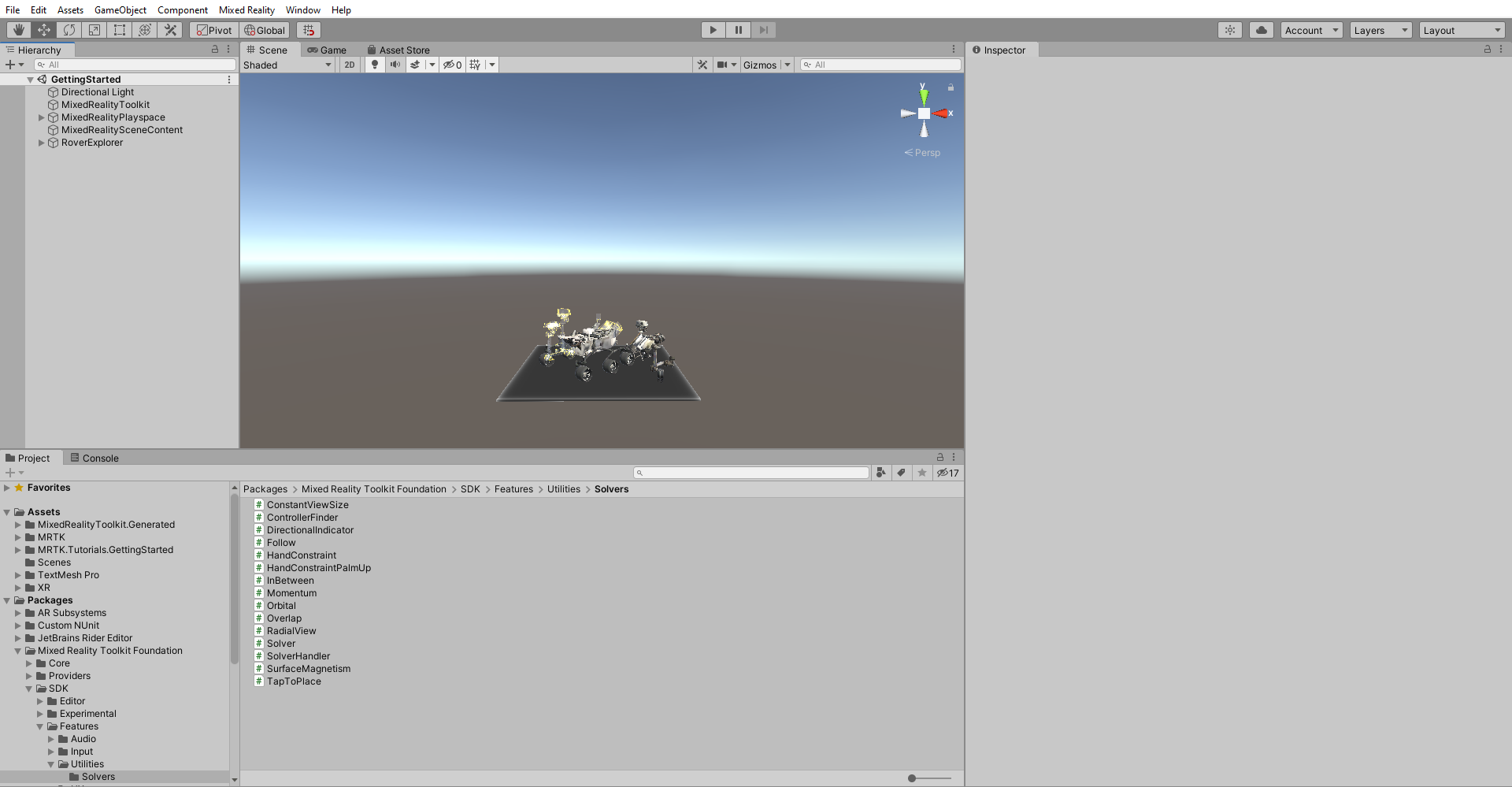 I risolutori di MRTK si trovano nella cartella MRTK SDK. Per visualizzare i suggerimenti disponibili nel progetto, nella finestra Progetto passare a Pacchetti>Manipolazione spaziale MRTK>Suggerimenti.