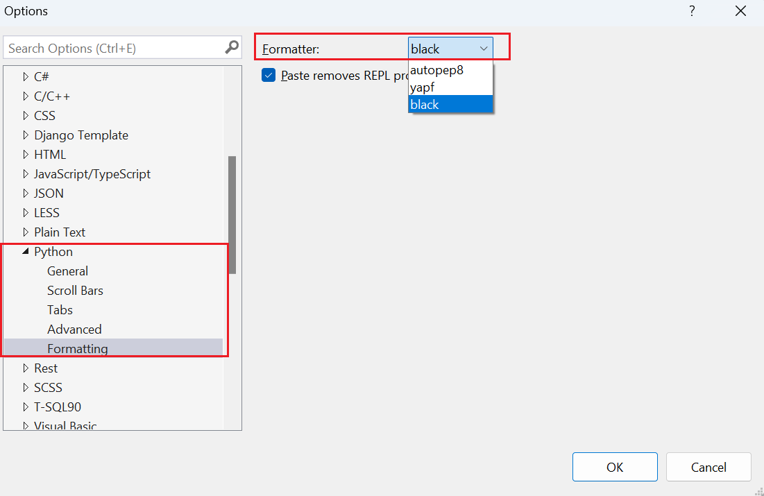 È possibile impostare il formattatore del codice sorgente tramite Strumenti>Opzioni> Editor >Formattazione>. Python Tools in Visual Studio supporta la formattazione del codice sorgente con autopep8, formattatore Nero e yapf.