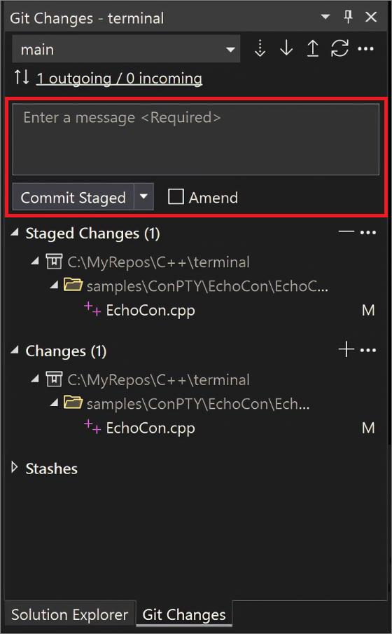 Dopo aver preparato il commit esaminando e mettendo in stage le modifiche desiderate; è possibile creare il commit usando la finestra Modifiche Git. Inserire un messaggio di commit e selezionare "Commit Staged" per completare il processo: