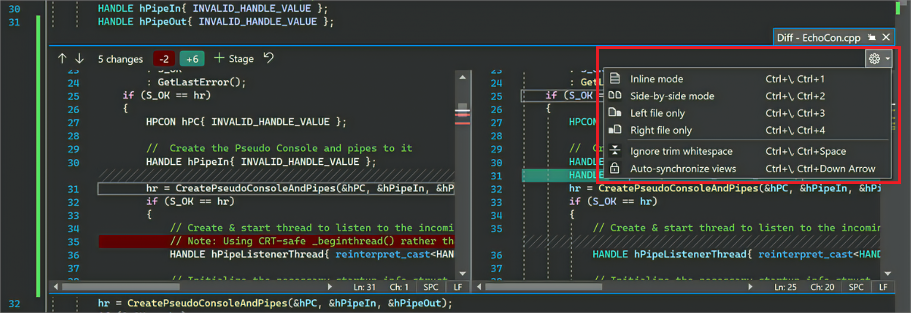 È possibile modificare il modo in cui Visual Studio interagisce con le modifiche al codice nell'interfaccia utente Peek Difference.