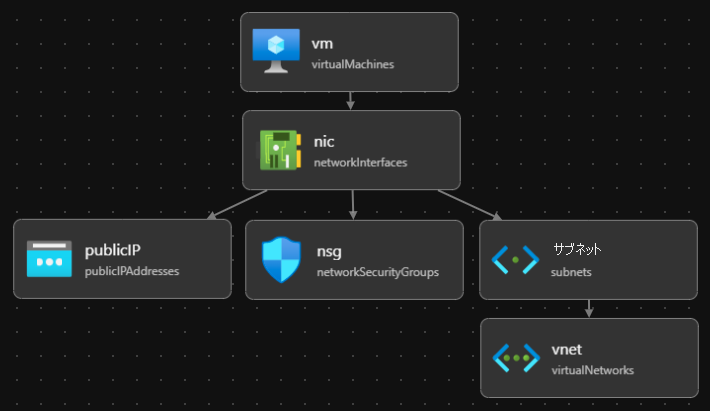 Bicep ビジュアライザーには、Bicep ファイルで定義されたリソースと、それらの間の依存関係が表示されます。 次の図は、Linux Virtual Machines 用の Bicep ファイルを視覚的に表したものです。
