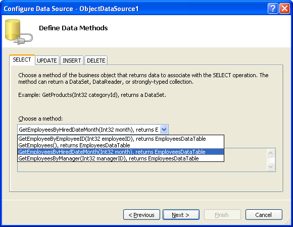 EmployeesBLLが SelectMethod に設定されたGetEmployeesByHiredDateMonth(month) クラスを使用するように ObjectDataSource を構成します。