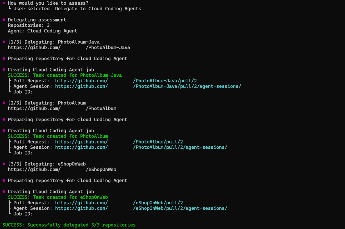 クラウド コーディング エージェントの委任を使用すると、すべてのリポジトリで並列実行を有効にすることができます。 このアプローチにより、大規模なポートフォリオの総評価時間が大幅に短縮されます。