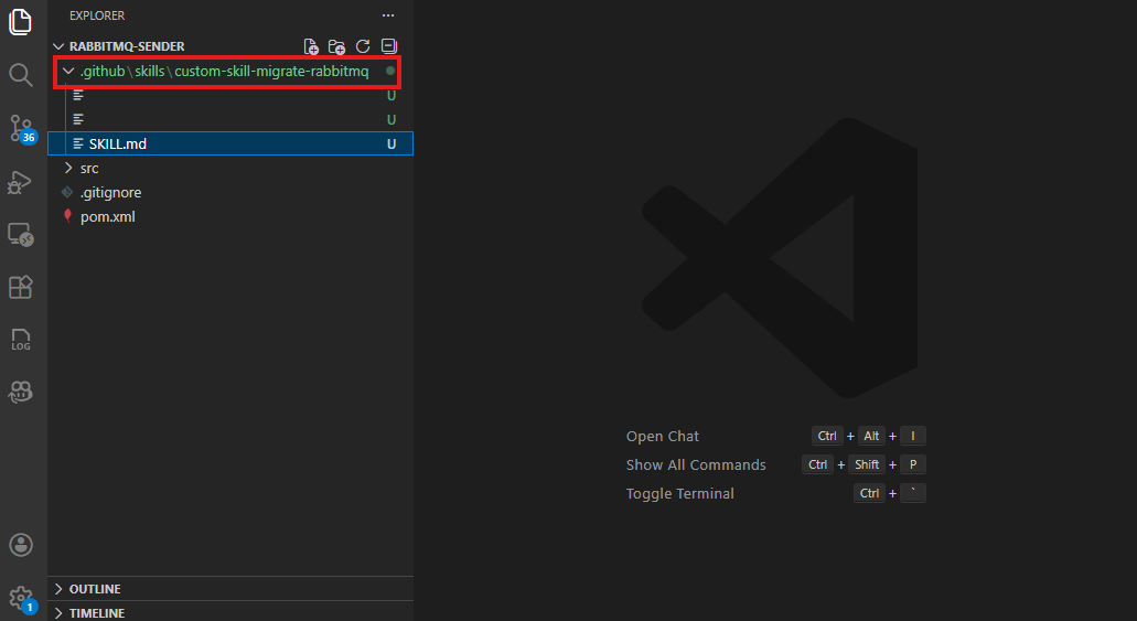 SKILL.mdファイルが開きます。 次のフィールドに入力してください。 完全なスキル形式の仕様については、 エージェント スキルの仕様を参照してください。- スキル名: スキルのわかりやすいハイフンで区切られた識別子。 たとえば、「Custom-skill-migrate-rabbitmq」などです。