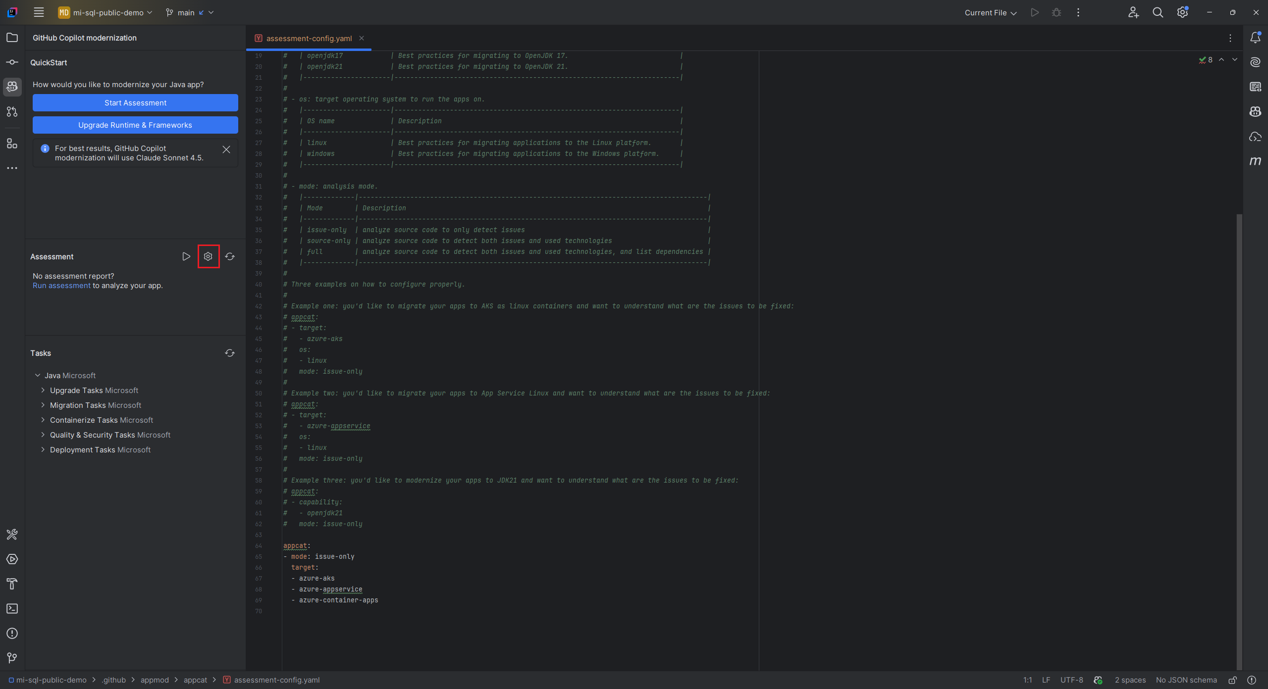 評価を実行する前に、GitHub Copilot モダン化評価ウィンドウで [ 評価の構成 ] を選択して 構成 します。