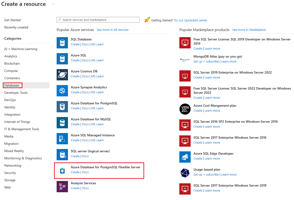 [データベース]>[Azure Database for PostgreSQL フレキシブル サーバー] を選びます。