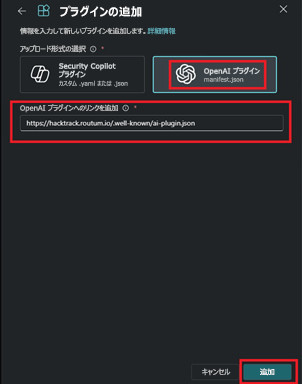 https://hacktrack.routum.io/.well-known/ai-plugin.jsonを入力して [追加] を選択します。