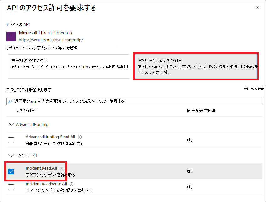 [アプリケーションのアクセス許可] を選択します。 シナリオに関連するアクセス許可 ( Incident.Read.All など) を選択し、[ アクセス許可の追加] を選択します。