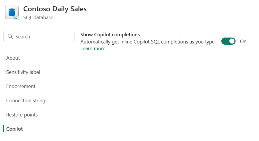 SQL データベース ワークロードの Fabric の Copilot には、Copilot を使用したコード補完機能が含まれています。