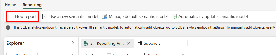 SQL 分析エンドポイント ビュー内には、[レポート] のメニュー オプションがあります。 次に、チュートリアルの前のステップにおいて SQL 分析エンドポイントで作成したビューに基づいてレポートを作成します。