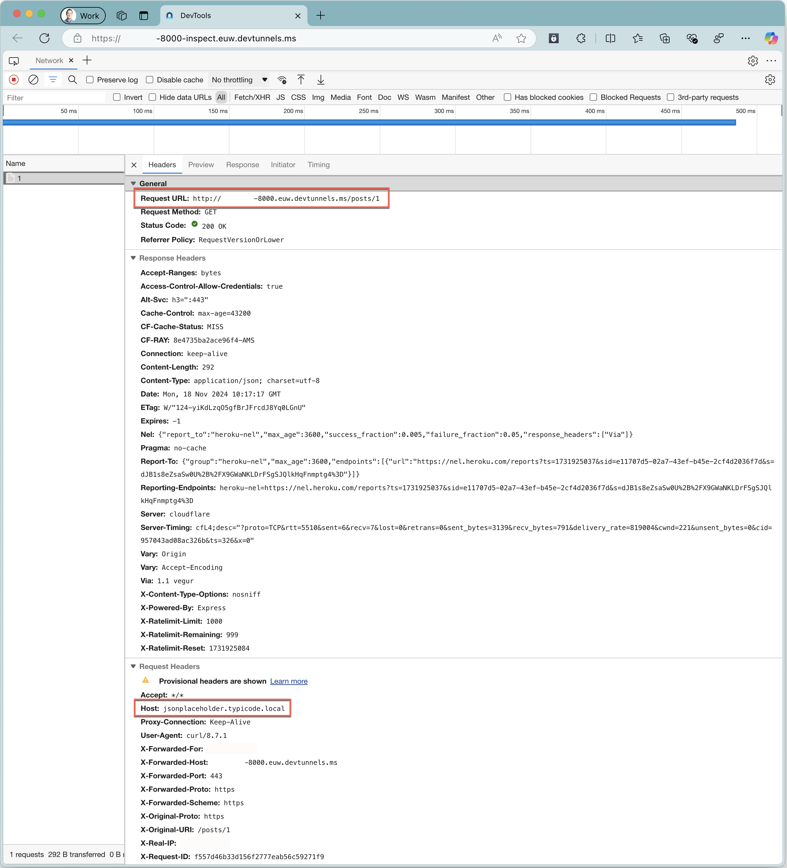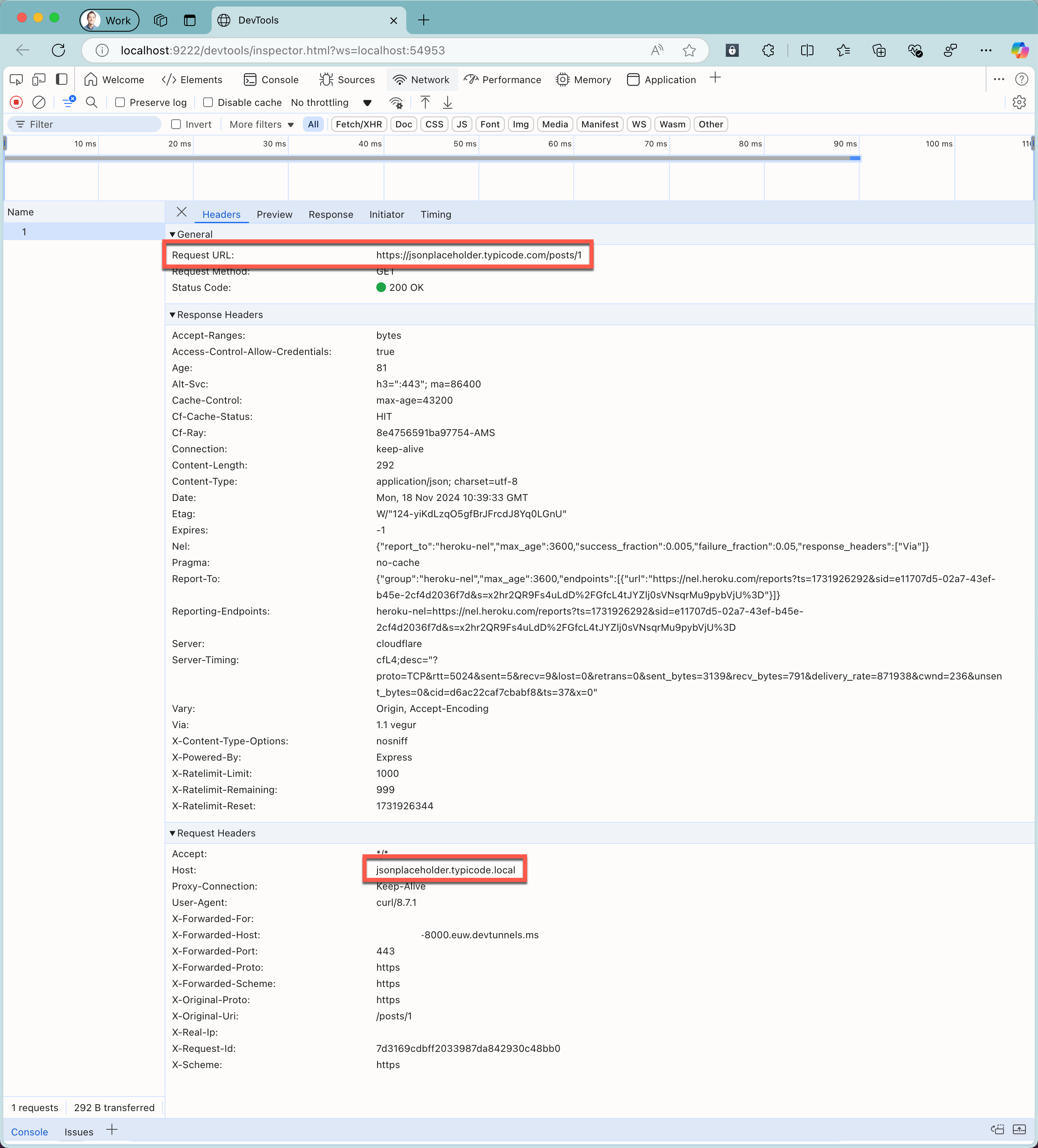 curl https://tunnel_id-8000.euw.devtunnels.ms/posts/1) を実行して、開発トンネル URL を使用してクラウド API を呼び出すクラウド サービスをシミュレートします。Chrome Dev Tools の Web ブラウザーで、傍受された要求とクラウド API からの応答に関する情報に注目します。