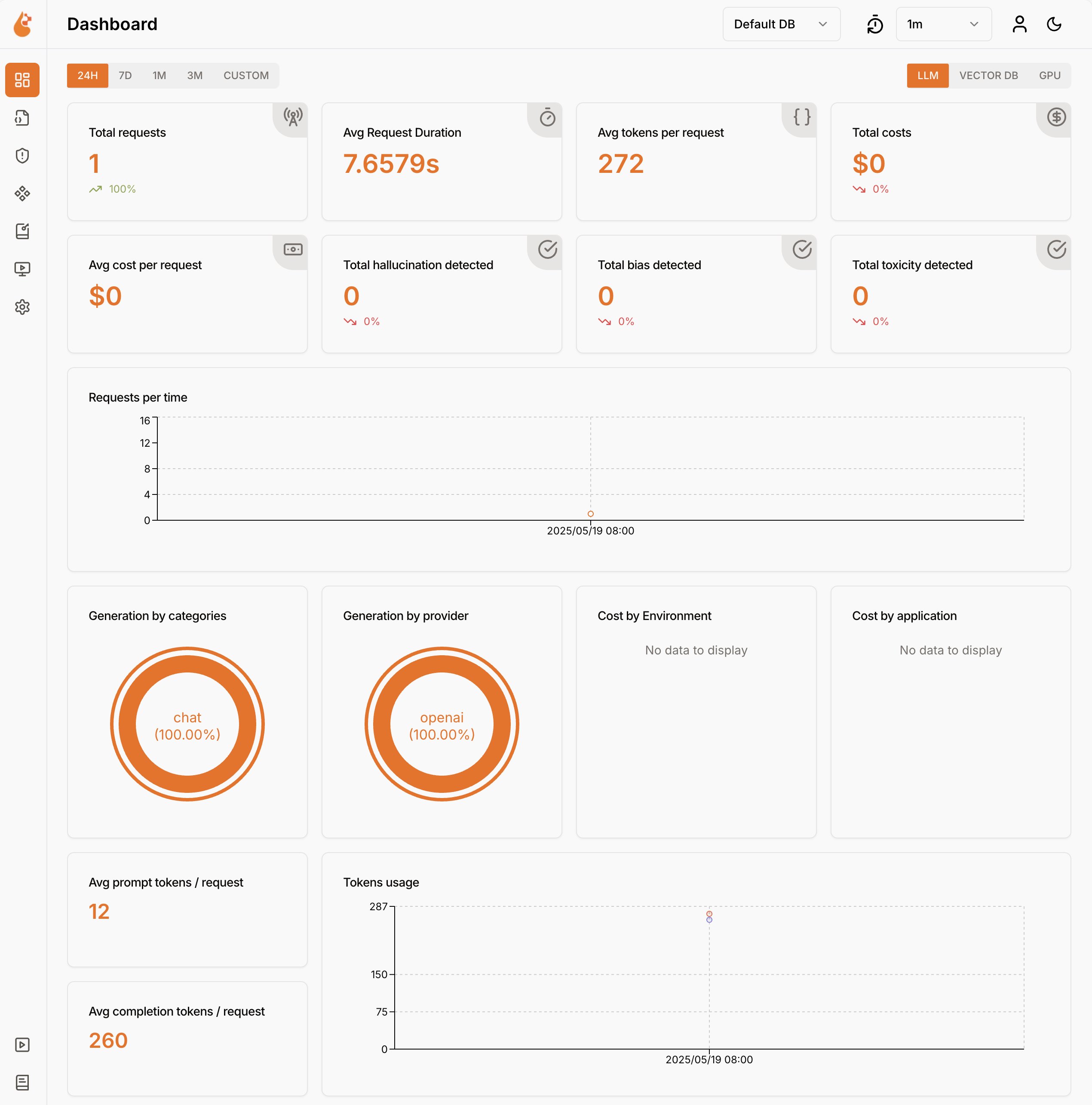 Dev Proxy は、OpenTelemetry 形式で言語モデルの使用状況データをログに記録します。 OpenTelemetry と互換性のあるダッシュボードを使用して、データを視覚化できます。 たとえば、Aspireダッシュボード または OpenLIT を使用できます。 テレメトリ データには、要求と応答で使用されるトークンの数、使用されたトークンのコスト、セッション全体のすべての要求の合計コストが含まれます。