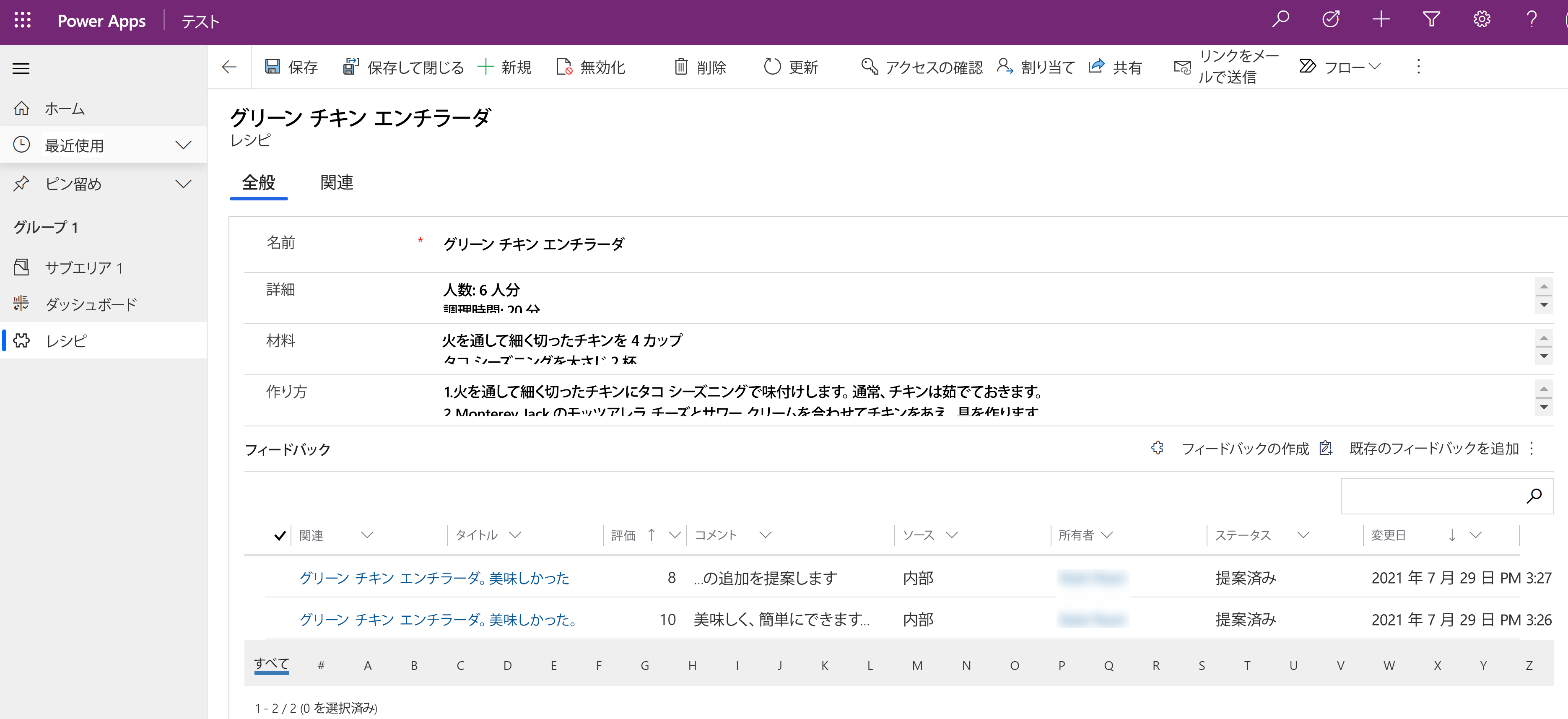 フィードバック用のサブグリッドをテーブル フォームに追加する