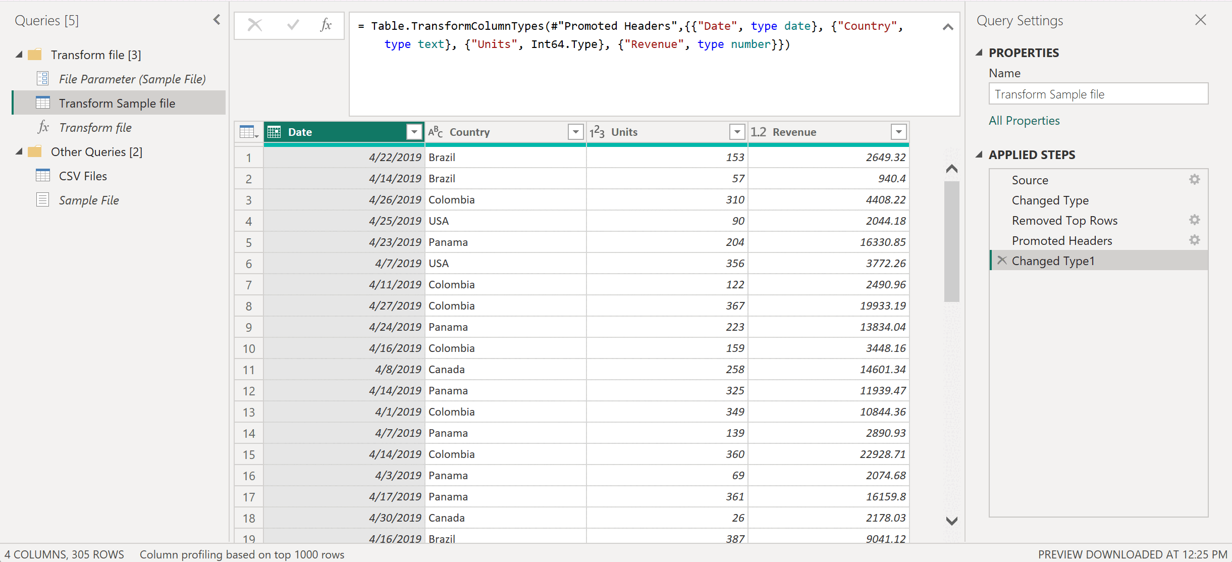列ヘッダーを昇格した後、Power Query既定では、各列のデータ型を自動的に検出する新しい Changed Type ステップが自動的に追加されます。 あなたの変換サンプルファイルクエリは、次の画像のようになります。