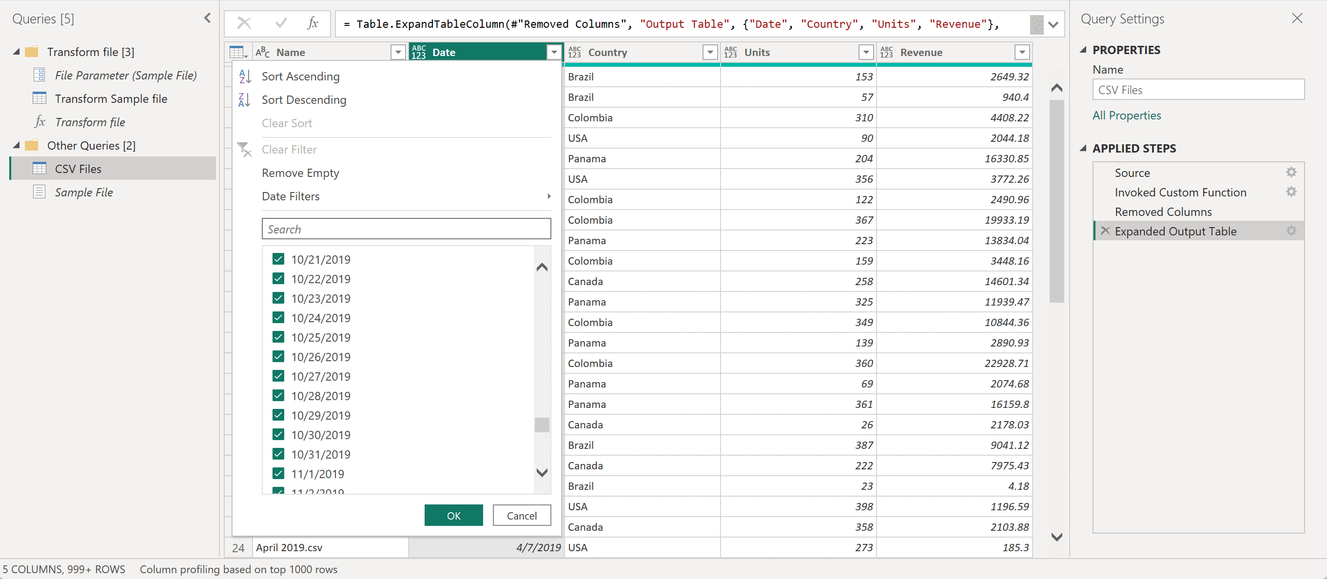 この新しいステップをクエリに適用すると、Transform file 関数が自動的に更新され、Transform Sample file で使用される 2 つのパラメーターに基づく 2 つのパラメーターが必要になります。