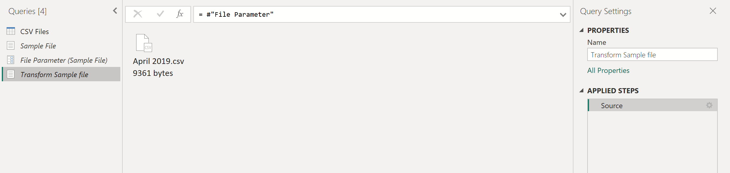 新しい関数を作成したら、変換サンプル ファイル名前のクエリを選択します。 このクエリは、変換ファイル 関数にリンクされたので、このクエリに加えられた変更が関数に反映されます。 この接続は、関数にリンクされたサンプル クエリの概念と呼ばれます。