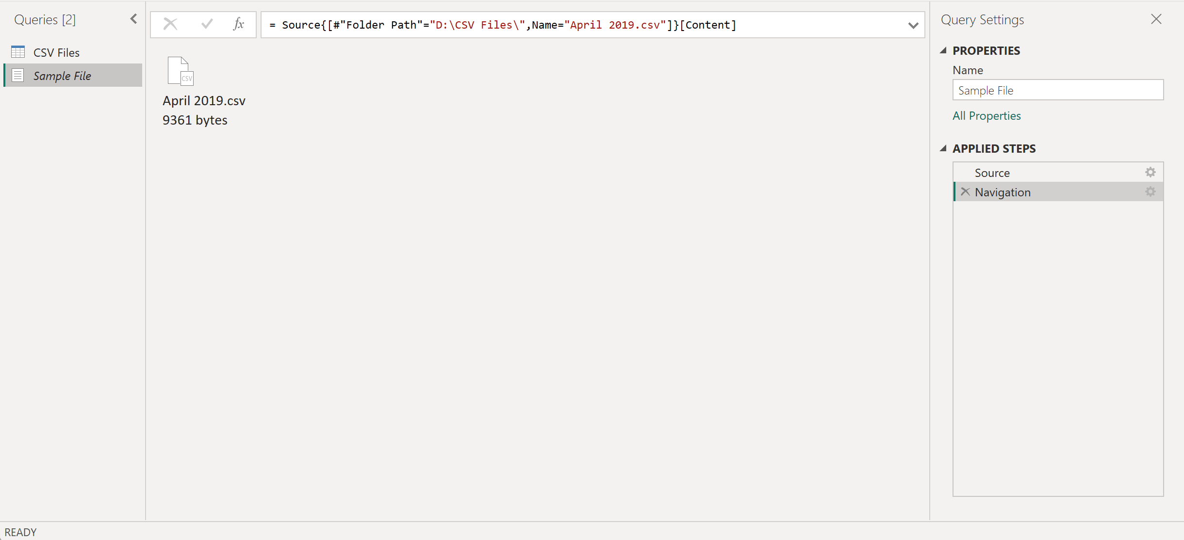 このオプションでは、実質的にそのファイルに直接バイナリとしてナビゲーション ステップを含む新しいクエリが作成されます。この新しいクエリの名前は、選択したファイルのファイル パスです。 このクエリの名前をサンプル ファイル に変更します。