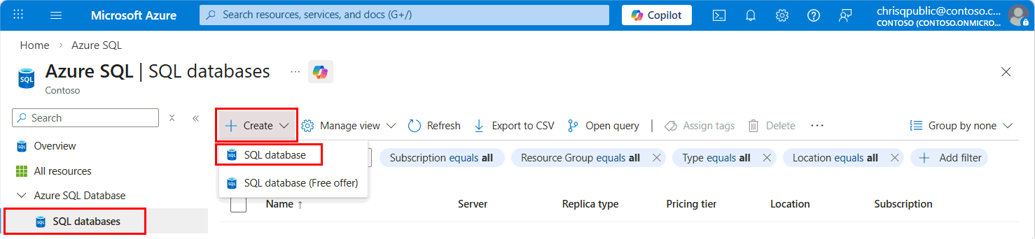 3. [ + 作成 ] ドロップダウン ボタンを選択し、 SQL データベースを選択します。