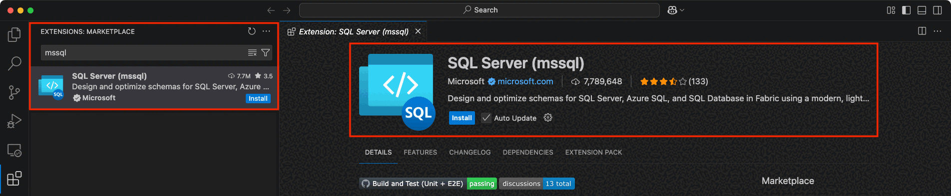Visual Studio Code で SQL 開発を開始するには、 MSSQL 拡張機能をインストールします。