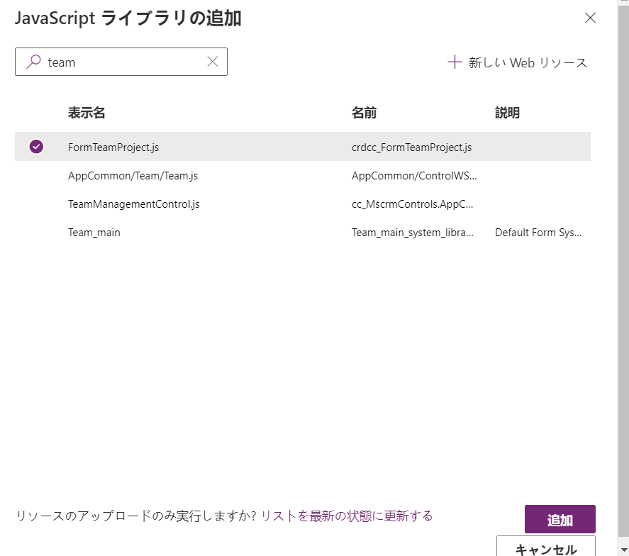 検索ボックスに team と入力し、Enter キーを押します。 FormTeamProject.js を選択し、追加を選択します。