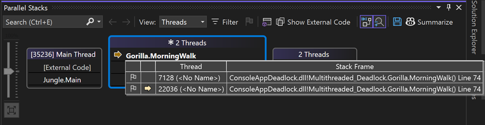 lock(tree)またはlock(banana_bunch)ステートメントに表示されます。lockを呼び出すと、FindBananasメソッド内のスレッドがブロックされます。 一方のスレッドは、treeのロックがもう一方のスレッドによって解放されるのを待っていますが、もう一方のスレッドは、banana_bunchのロックを解放する前に、treeのロックが解除されるのを待ちます。 これは、2 つのスレッドが互いに待機しているときに発生するクラシック デッドロックの例です。Copilot を使用している場合は、AI によって生成されたスレッドの概要を取得して、潜在的なデッドロックを特定することもできます。