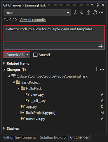 コードをリファクタリングして更新プログラムをテストしたら、変更を確認してソース管理にコミットできます。