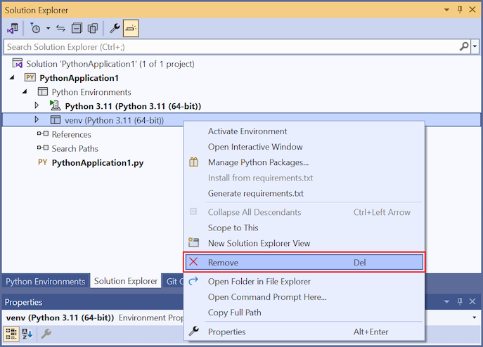 Python プロジェクトを削除するには、 ソリューション エクスプローラーで Python 環境を参照します。 削除する Python 環境を右クリックし、[削除] を選択 します