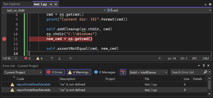 デバッグを開始するには、コードに初期ブレークポイントを設定し、テスト エクスプローラー でテスト (または選択項目) を右クリックし、[ 選択したテストのデバッグ] を選択します。 Visual Studio は、アプリケーション コードの場合と同様に Python デバッガーを起動します。