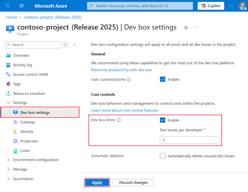 - Set a dev box limit for your project in the Azure portal