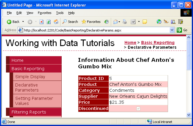 Ao visitar esta página, o controle Web de dados invocará o método Select do ObjectDataSource, que chamará o método da classe ProductsBLL, usando o valor constante de 5 para o parâmetro de entrada productID. O método retornará um objeto fortemente tipado ProductDataTable que contém uma única linha com informações sobre o produto "Chef Anton's Gumbo Mix" (o produto com o código ProductID 5).