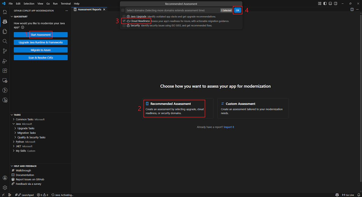 Na barra lateral, selecione o painel de modernização do GitHub Copilot e selecione Iniciar Avaliação ou Abrir Painel de Avaliação na seção INÍCIO RÁPIDO .